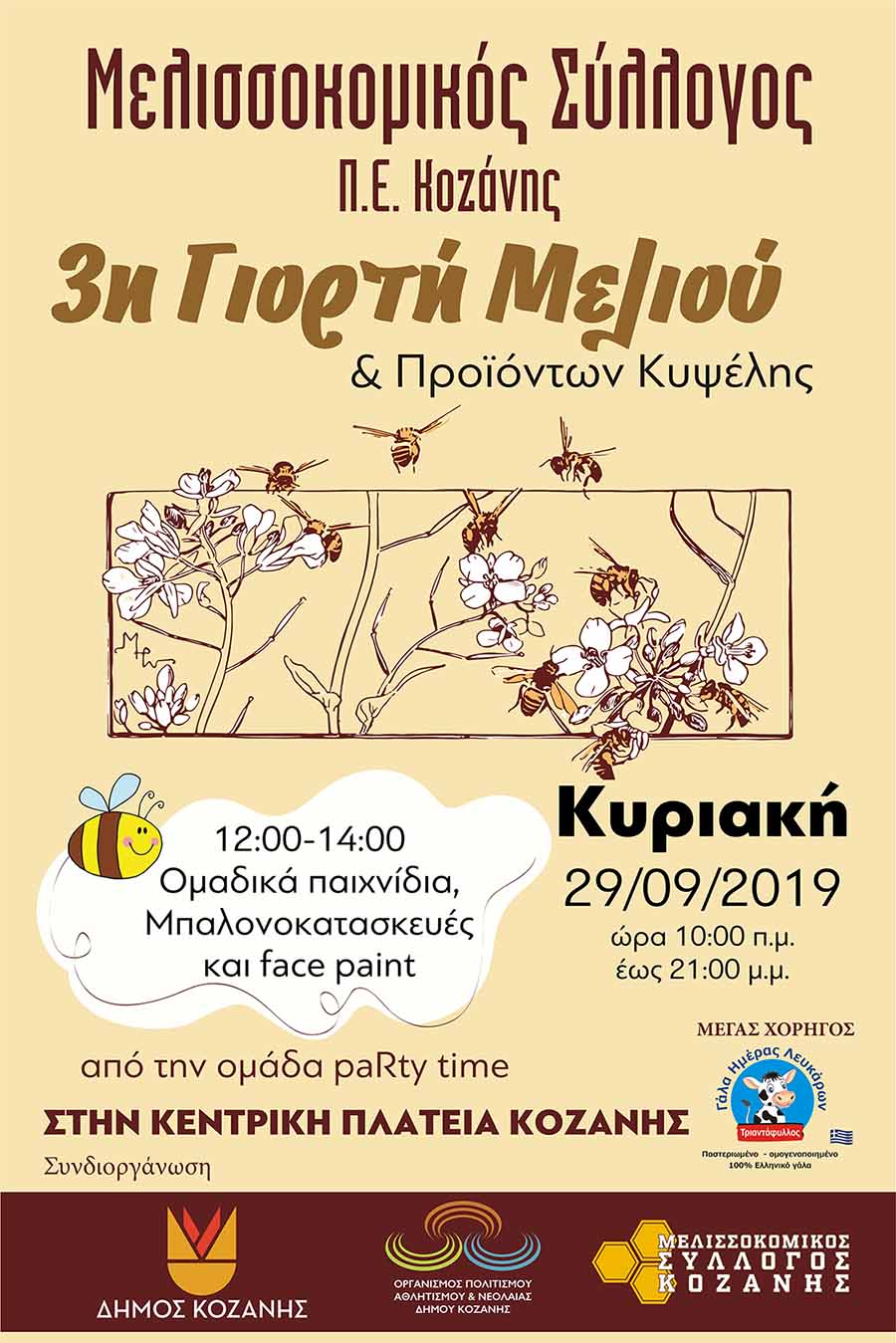 Για 3η συνεχόμενη χρονιά ο Μελισσοκομικός Σύλλογος Κοζάνης σε συνεργασία με τον Δήμο Κοζάνης διοργανώνουν την 3η Γιορτή Μελιού και προϊόντων κυψέλης, που θα πραγματοποιηθεί στην κεντρική πλατεία της Κοζάνης στις 29 Σεπτεμβρίου 2019 και ώρες 10:00-21:00.