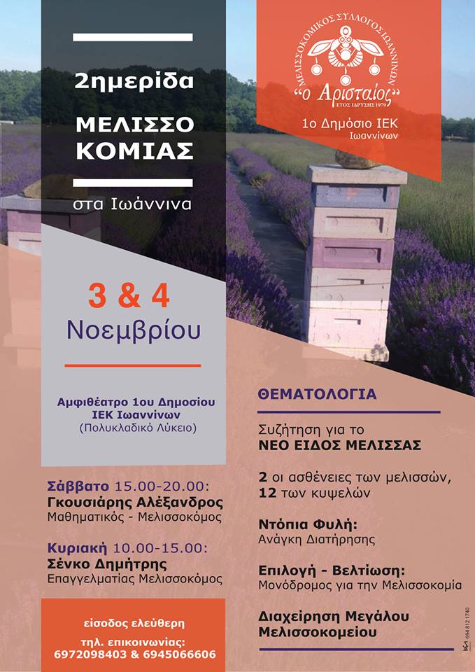 Ο Μελισσοκομικός Σύλλογος Ιωαννίνων «ο Αρισταίος» διοργανώνει διημερίδα μελισσοκομίας στις 3 και 4 Νοεμβρίου στο Αμφιθέατρο του 1ου Δημοσίου ΙΕΚ Ιωαννίνων.