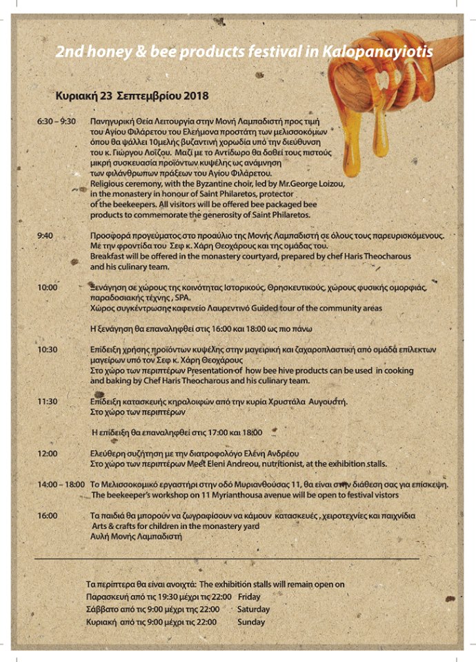 Μεταξύ άλλων εκεί θα βρίσκεται και ο Παγκύπριος Σύνδεσμος Μελισσοκόμων, που όμως μας ενημέρωσε θα έχει ειδικά διαμορφωμένο περίπτερο στο φεστιβάλ.