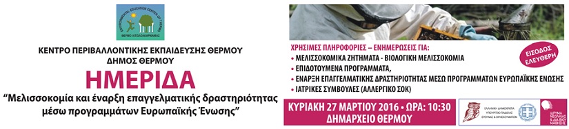 Το Κέντρο Περιβαλλοντικής Εκπαίδευσης Θέρμου σε συνεργασία με τον Δήμο Θέρμου και στο πλαίσιο του Έργου Δράσεις Δια Βίου Μάθησης για το Περιβάλλον και την Αειφορία διοργανώνει ημερίδα με θέμα: Μελισσοκομία και έναρξη επαγγελματικής δραστηριότητας μέσω των προγραμμάτων της Ευρωπαϊκής Ένωσης.
