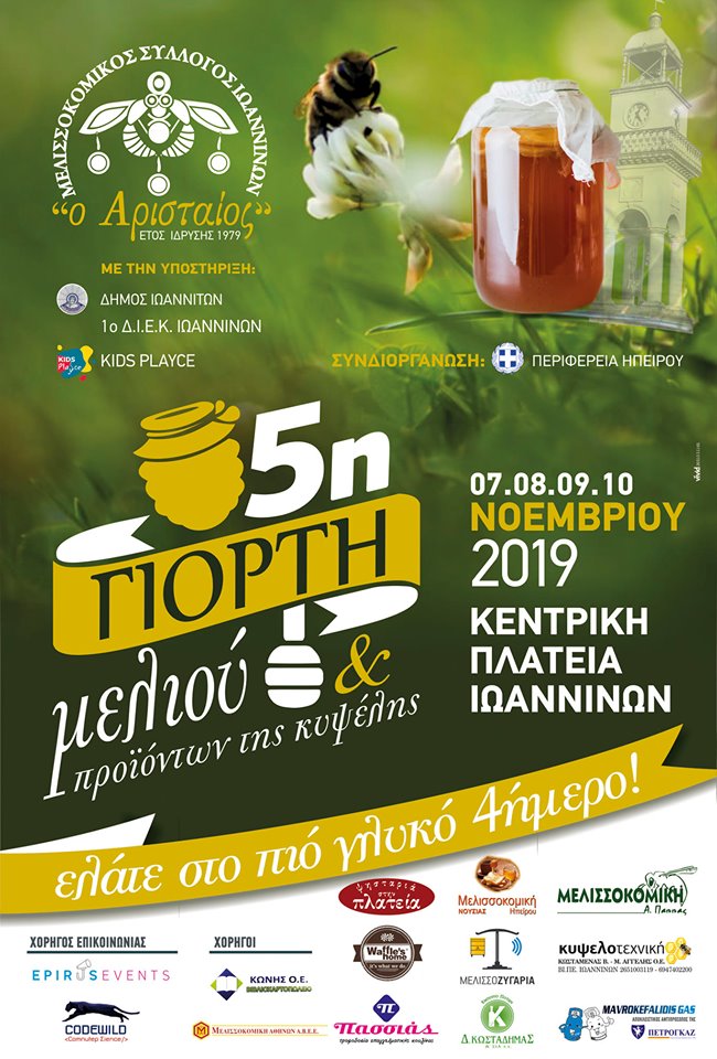 Ο Μελισσοκομικός Σύλλογος Ιωαννίνων ο Αρισταίος διοργανώνει την 5η Γιορτή Μελιού στις 7-8-9 & 10 Νοεμβρίου στην κεντρική πλατεία Ιωαννίνων. Θα συμμετάσχουν μελισσοκόμοι μέλη του συλλόγου με τα προϊόντα τους.