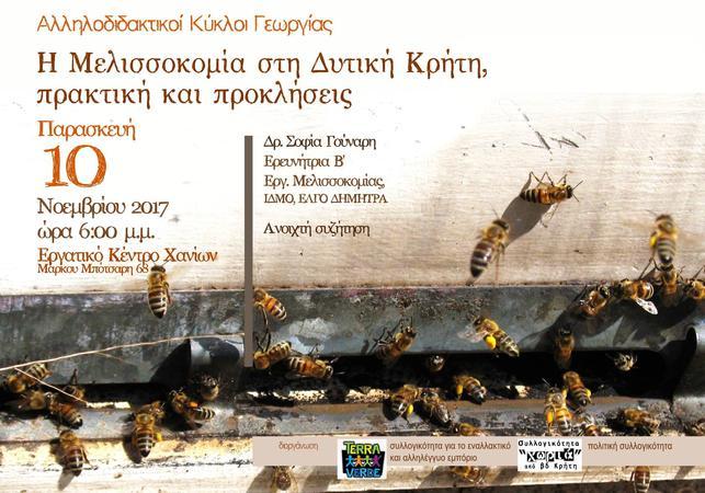 Την Παρασκευή 10 Νοεμβρίου στις 6 το απόγευμα στο Εργατικό Κέντρο Χανίων, οι δύο πολιτικές συλλογικότητες, η Terra Verde για το εναλλακτικό και αλληλέγγυο εμπόριο και η συλλογικότητα »Χωριά Β.Δ. Κρήτης», οργανώνουν εκδήλωση-ανοιχτή συζήτηση με θέμα την μελισσοκομία. Καλεσμένη είναι η ερευνήτρια μελισσοκομίας Δρ. Σοφία Γούναρη.