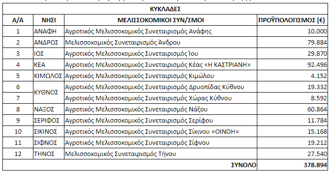 Για τον Μελισσοκομικό Συνεταιρισμό Τήνου το ποσό που αναλογεί είναι 27.540€. Το μεγαλύτερο ποσό από τις Κυκλάδες θα λάβει ο Αγροτικός Μελισσοκομικός Συνεταιρισμός Κέας «Η ΚΑΣΤΡΙΑΝΗ» με 92.496€. Ακολουθεί ο Μελισσοκομικός Συνεταιρισμός Άνδρου με 79.884€ και ο Αγροτικός Μελισσοκομικός Συνεταιρισμός Νάξου με 60.864€.