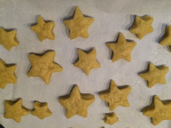Το ζυμάρι είναι εύπλαστο, ακριβώς με την υφή που έχουν τα μελομακάρονα με ζάχαρη. Δοκιμάσαμε να φτιάξουμε τα μελομακάρονα σε σχήμα αστεριού σε διάφορα μεγέθη, για να κεντρίσουμε το ενδιαφέρον των παιδιών.