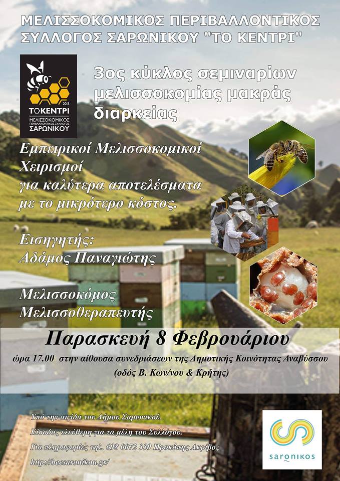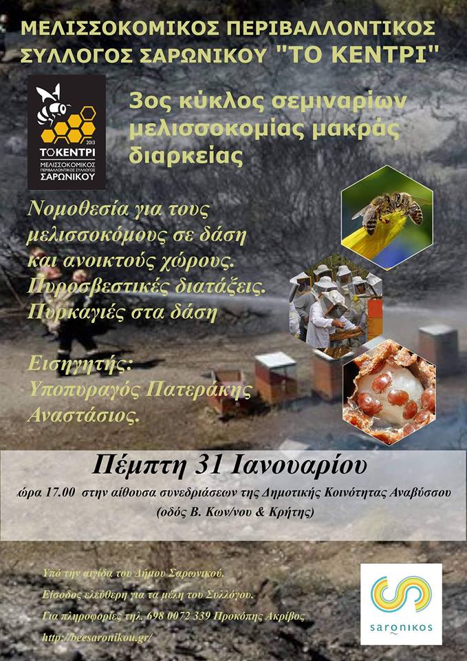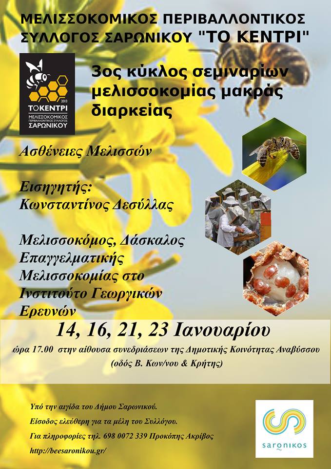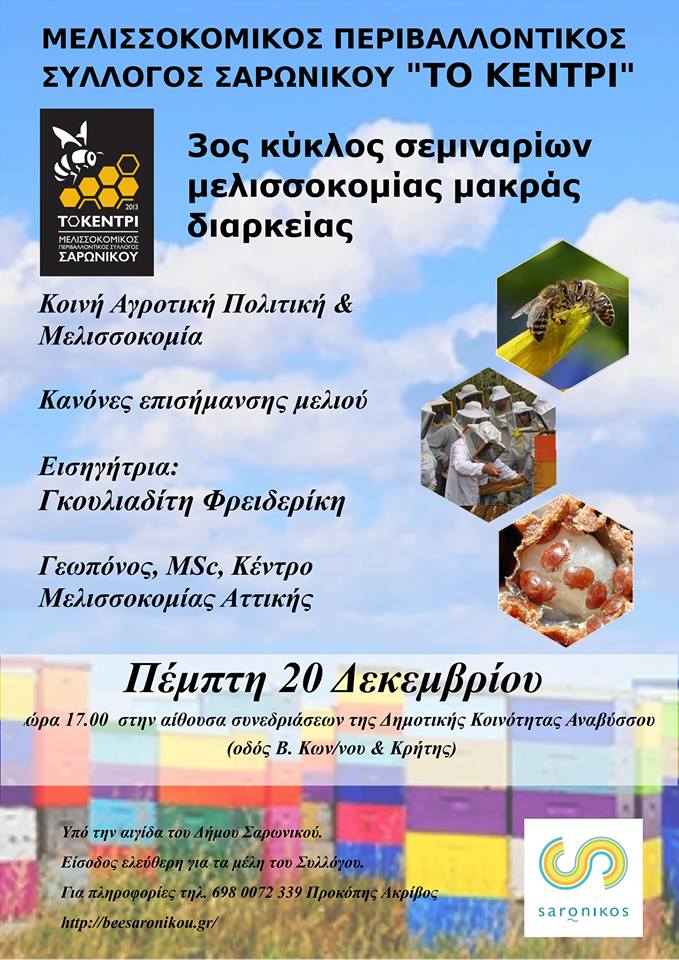 O Μελισσοκομικός Περιβαλλοντικός Σύλλογος Σαρωνικού “Το Κεντρί”, διοργανώνει τη Πέμπτη 20 Δεκέμβριου, σεμινάριο μελισσοκομίας με θέματα: