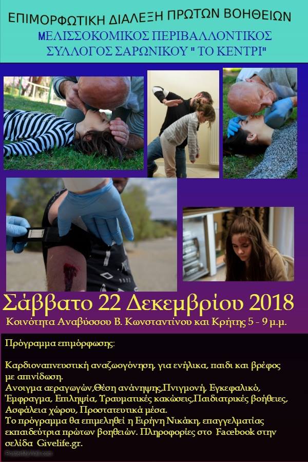Η εισηγήτρια κ.Νικάκη Ειρήνη θα κάνει ενημέρωση όλου το προγράμματος Πρώτων Βοηθειών σε ενήλικους και παιδιά διάρκειας 3,5 ωρών.