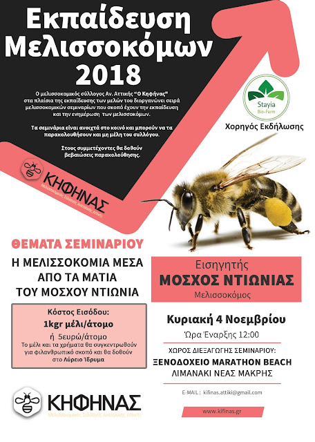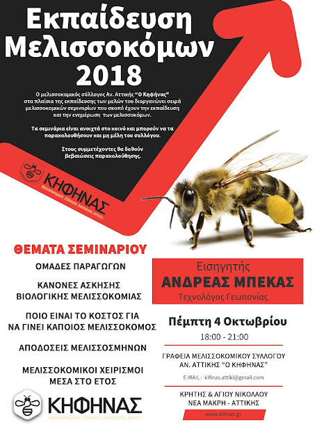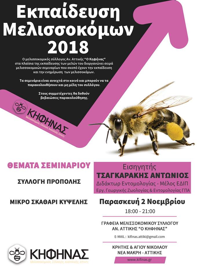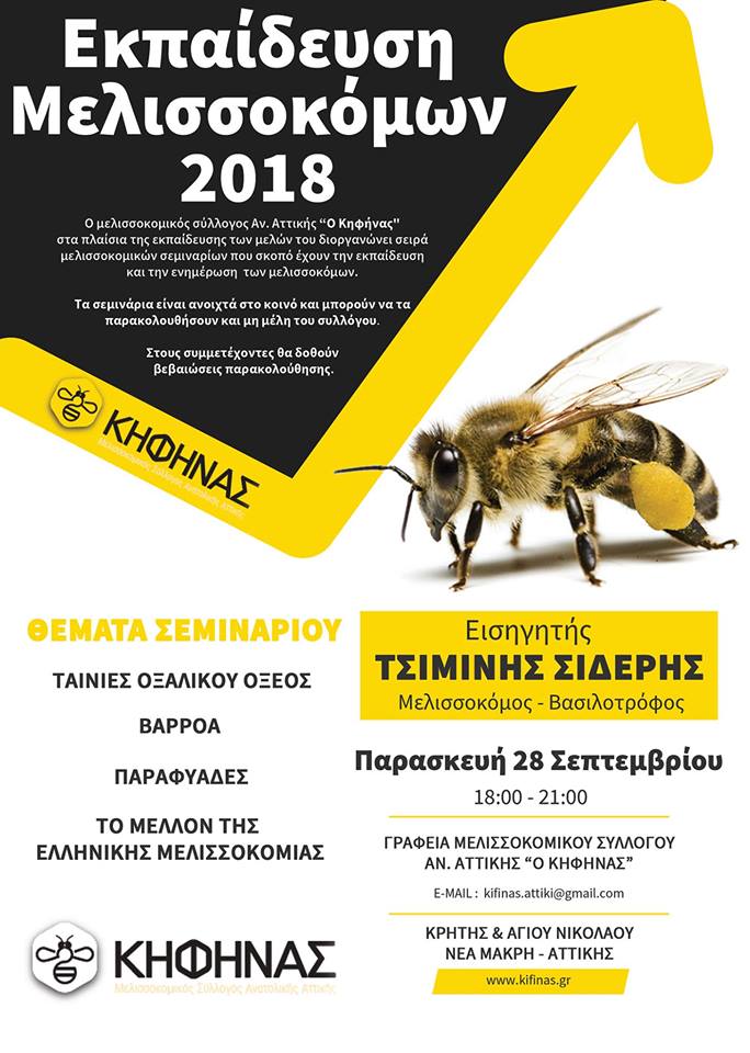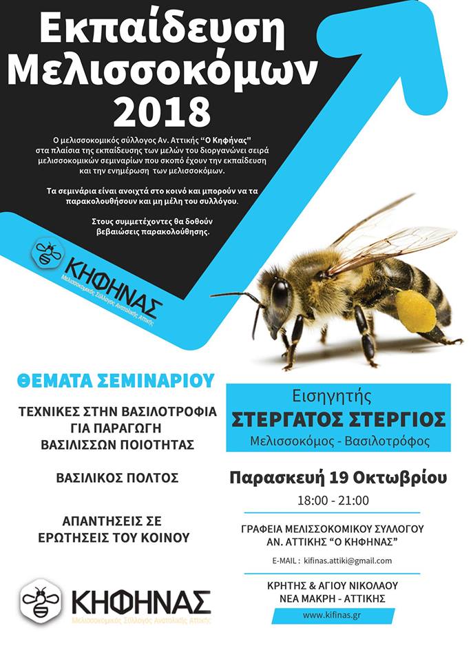 Ο μελισσοκομικός σύλλογος Αν.Αττικής “Ο Κηφήνας” στα πλαίσια της εκπαίδευσης των μελών του διοργανώνει σειρά μελισσοκομικών σεμιναρίων που σκοπό έχουν την εκπαίδευση και την ενημέρωση των μελισσοκόμων.