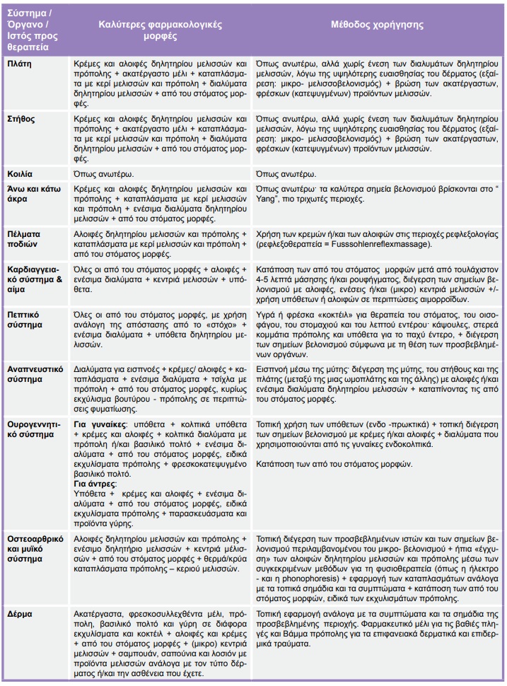 Εκείνες που ανακουφίζουν και κατά συνέπεια βελτιώνουν άμεσα ή μακροπρόθεσμα την υγεία, τη δύναμη και την ομορφιά μας. Συνιστάται πάντα (εκτός από τα έκτακτα περιστατικά, όπως τα εγκαύματα παντός τύπου) να χρησιμοποιηθούν τα προϊόντα μελισσών αρχικά σε πολύ μικρές δόσεις (ώστε να εξετασθεί το ενδεχόμενο πιθανής αλλεργίας ή δυσανεξίας), από το να γίνει βαθμιαία αύξηση έως ότου εμφανιστεί σαφής βελτίωση (βλ.πιο κάτω: τη σχέση χρόνου/ποσότητας).