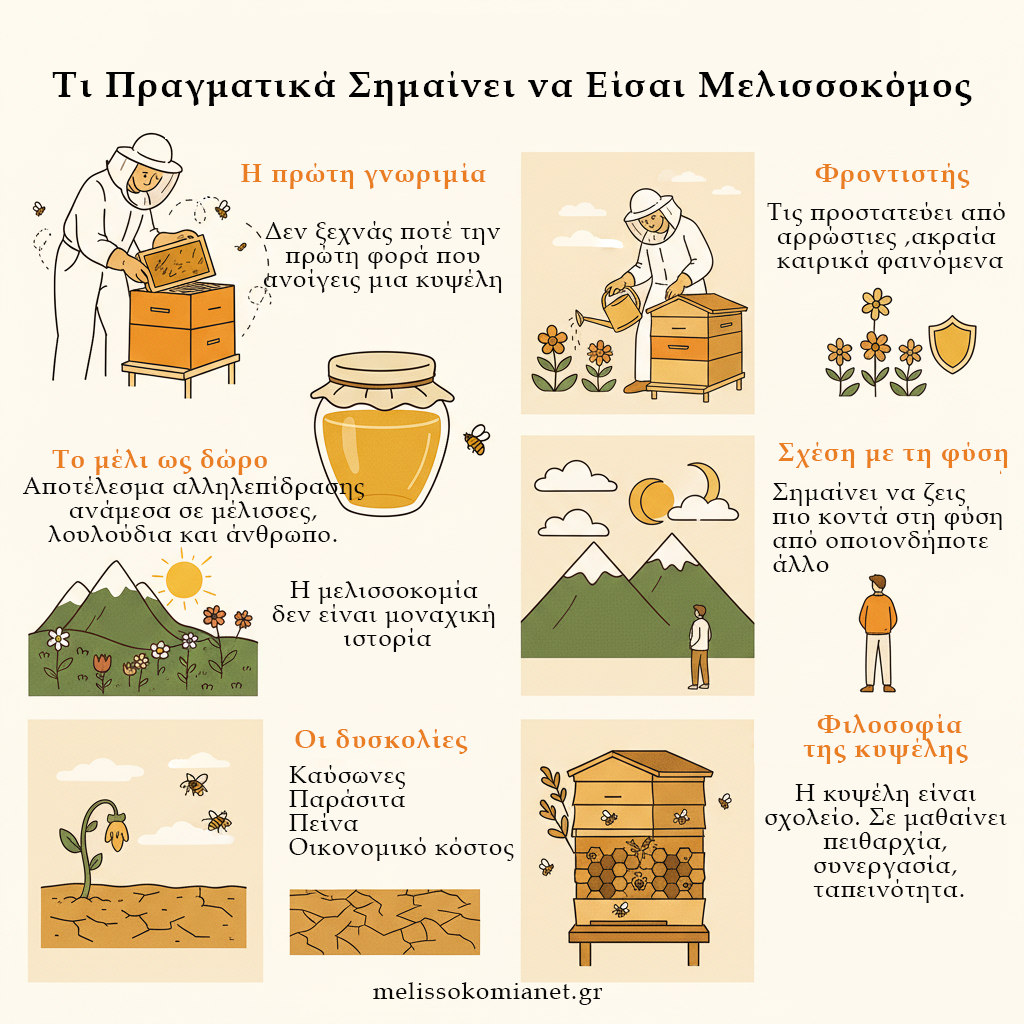 Αν ρωτήσεις κάποιον τι σημαίνει να είσαι μελισσοκόμος, οι περισσότεροι θα σου πουν: «Παράγεις μέλι». Κι όμως, η αλήθεια είναι πολύ πιο βαθιά. Η μελισσοκομία δεν είναι απλά ένα επάγγελμα. Είναι ένας τρόπος ζωής, μια καθημερινή συνάντηση με τη φύση, μια σχέση εμπιστοσύνης ανάμεσα σε έναν άνθρωπο και χιλιάδες μικροσκοπικές ζωές. Να είσαι μελισσοκόμος σημαίνει να γίνεσαι μέρος ενός κόσμου μαγικού, γεμάτου θαύματα και προκλήσεις.